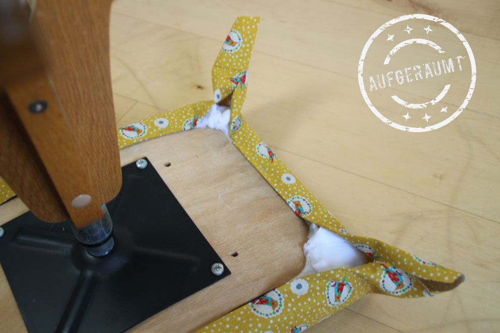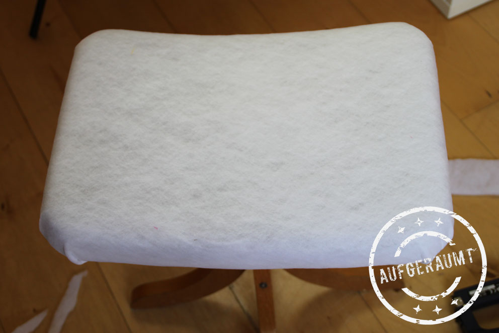 Den alten Samtstoff konnte ich leider nicht entfernen, weshalb ich mich kurzerhand entschied, ihn einfach drunter zu lassen. Damit der neue Stoff besser sitzt, wurde ein passender Vliesstoff unterfüttert und angetackert.