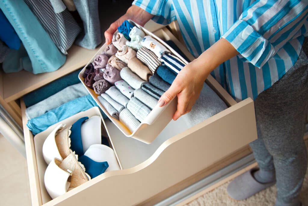 - Richtige Falttechnik: Kleidung wird platzsparend und übersichtlich gefaltet, sodass alles sichtbar bleibt.